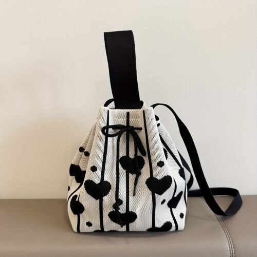 Women’s Casual Knit Polyester Drawstring Bag with Heart Pattern – Beige & Black, Fixed Shoulder Strap & Adjustable Drawstring Closure, Lightweight Spring Fashion Accessory for Everyday Use, Knit Handbag, Versatile Carryall, Chic Tote, Durable Construction, Stylish Tote, Fashionconscious Women, Handbag for Daily Use, Minimalist Handbag, Soft Fabric Tote, Trendy Handbag, Daily Essentials Bag