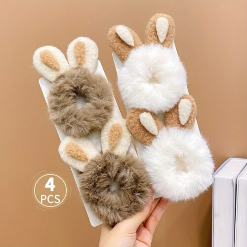 4pcs Lemon Love Girls’ Plush Rabbit Ear Hair Ties – Soft Stretchy Hair Bands with Cute Bunny Ears, Assorted Colors (White/Beige/Brown) for Teens, Hair Accessories, Playful Design, Flexible Hairbands