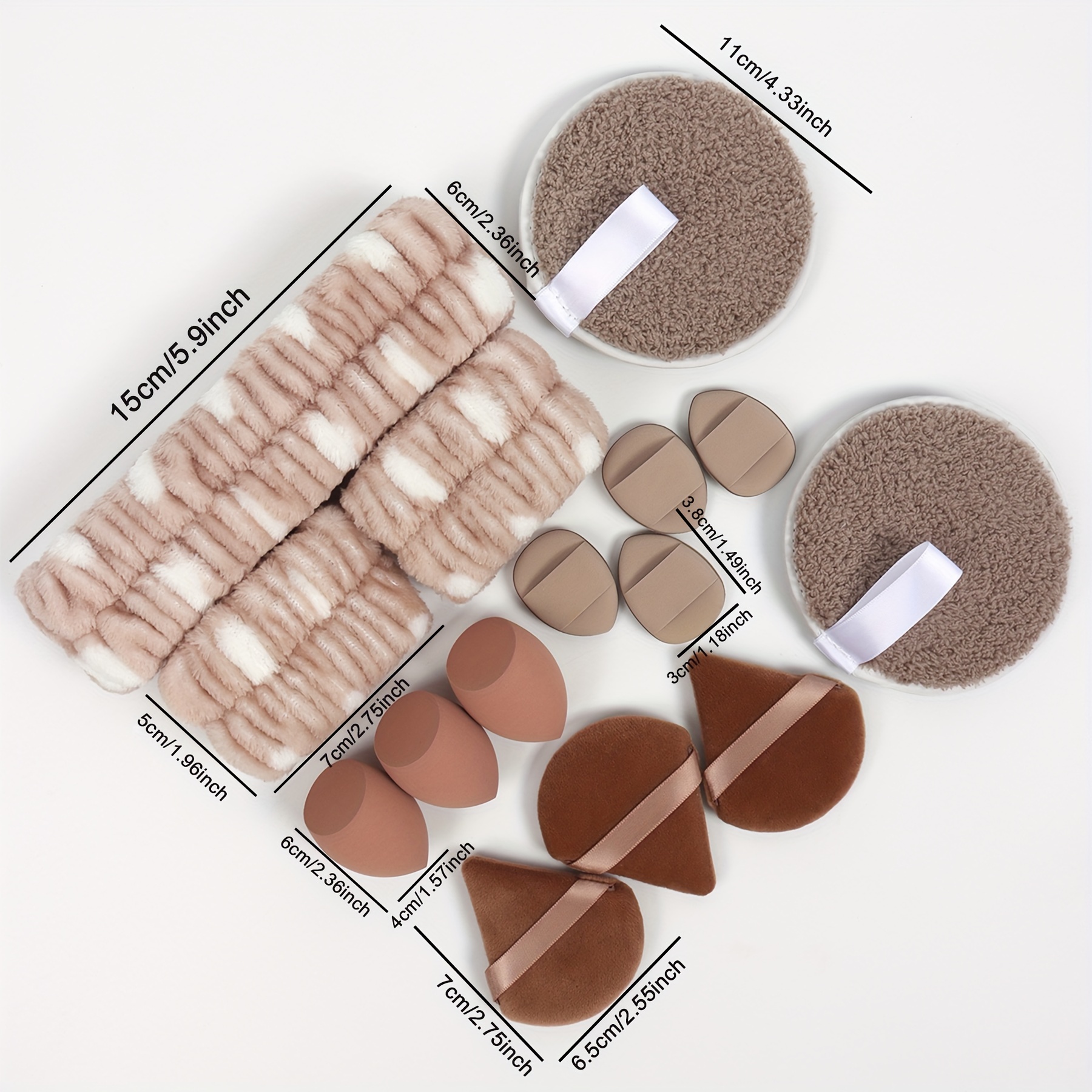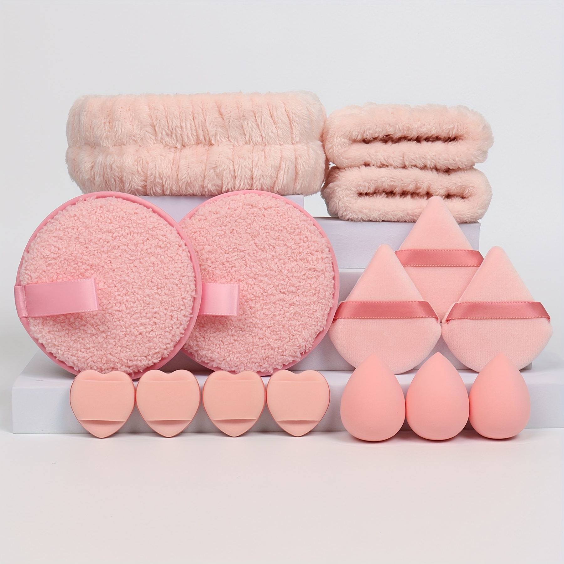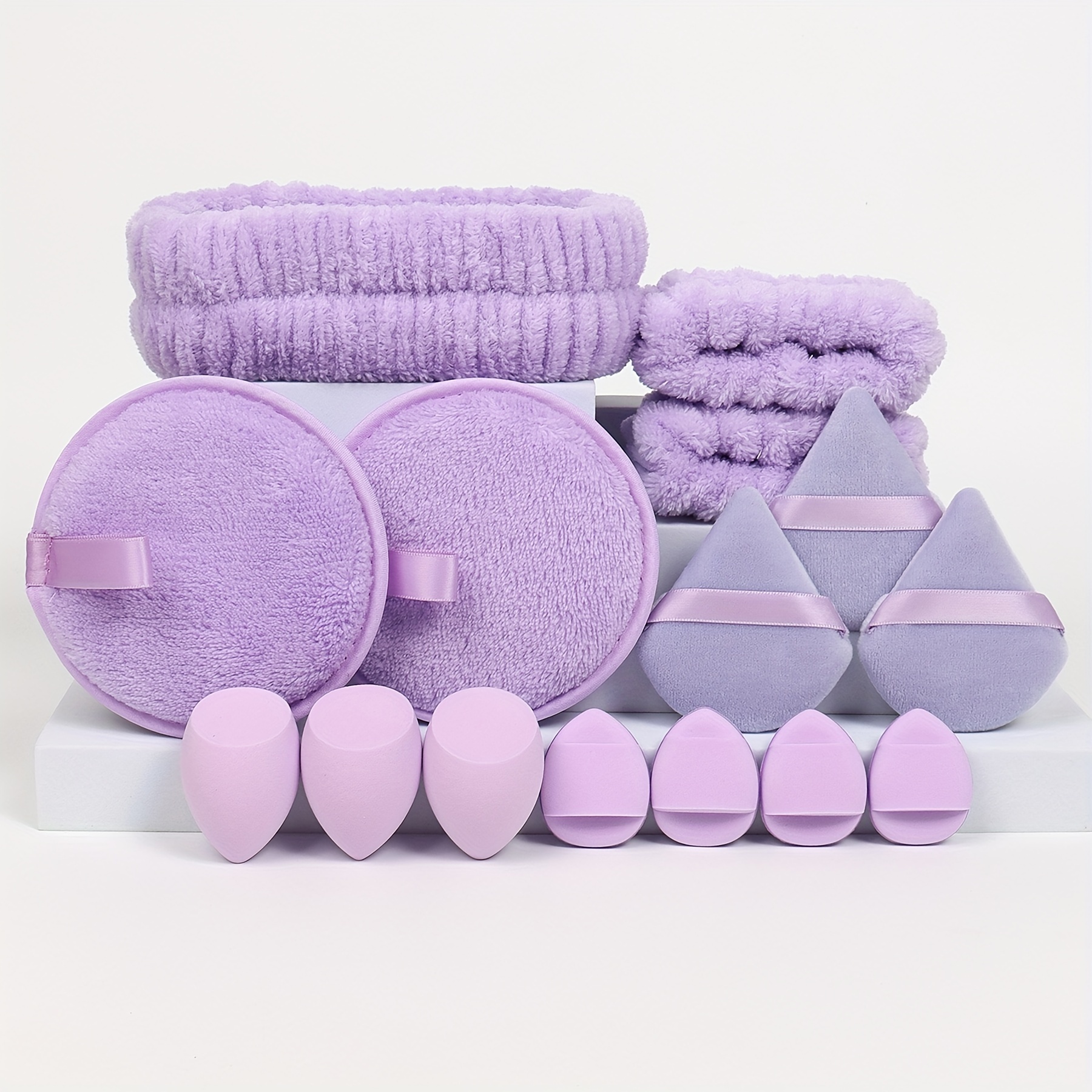15pcs set of hair tie lazy puff. 2 face wash puffs & 3 makeup sponges & 3 triangular loose powder puffs & 4 mini air cushions & 1 headband & 2 wristbands. Facial sponge, used for daily exfoliation and cleansing, foam removal and facial scrubbing