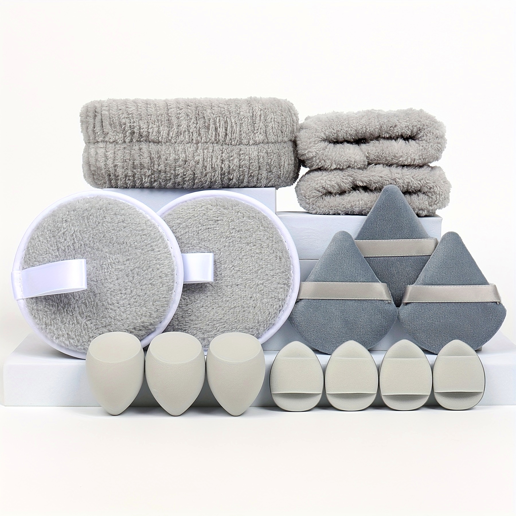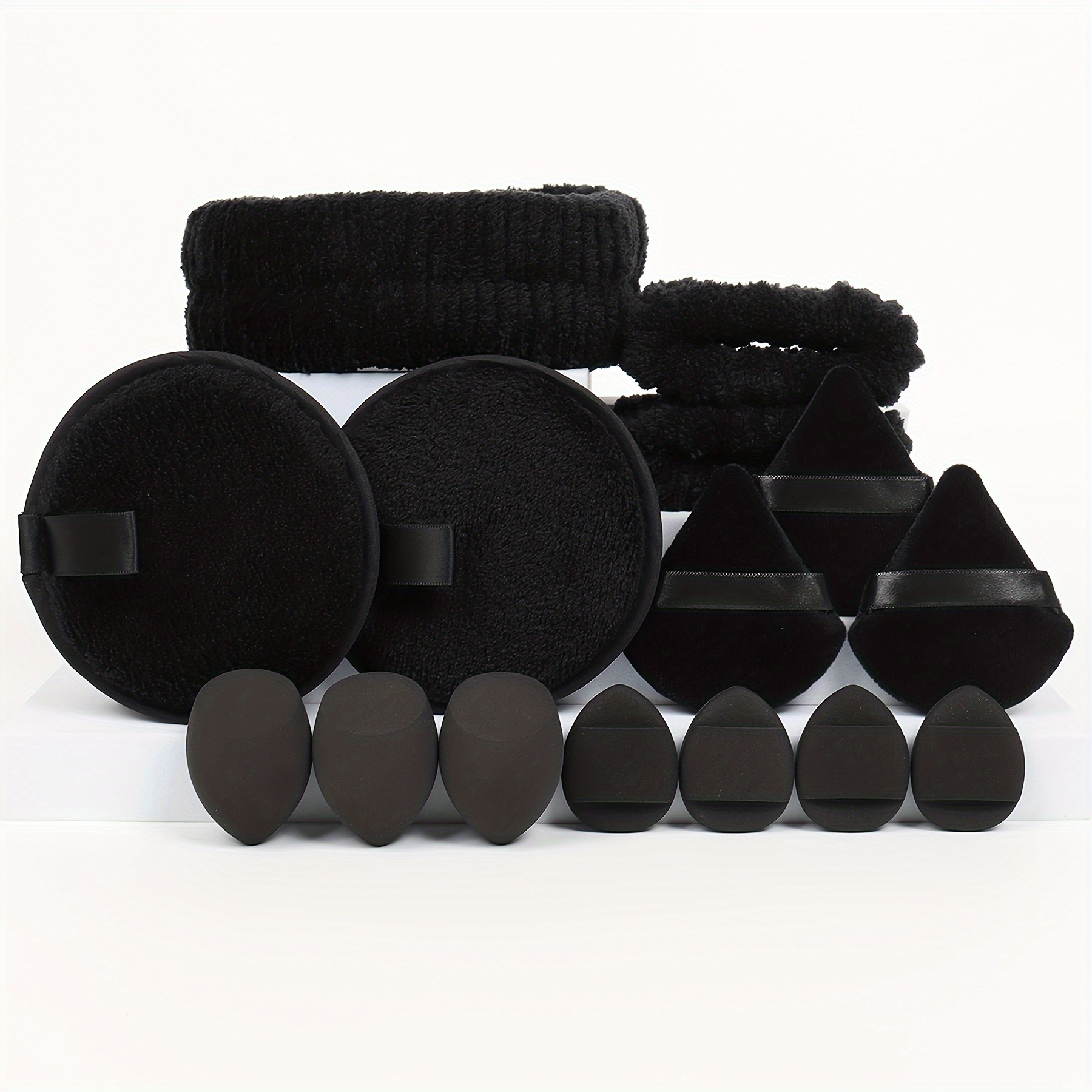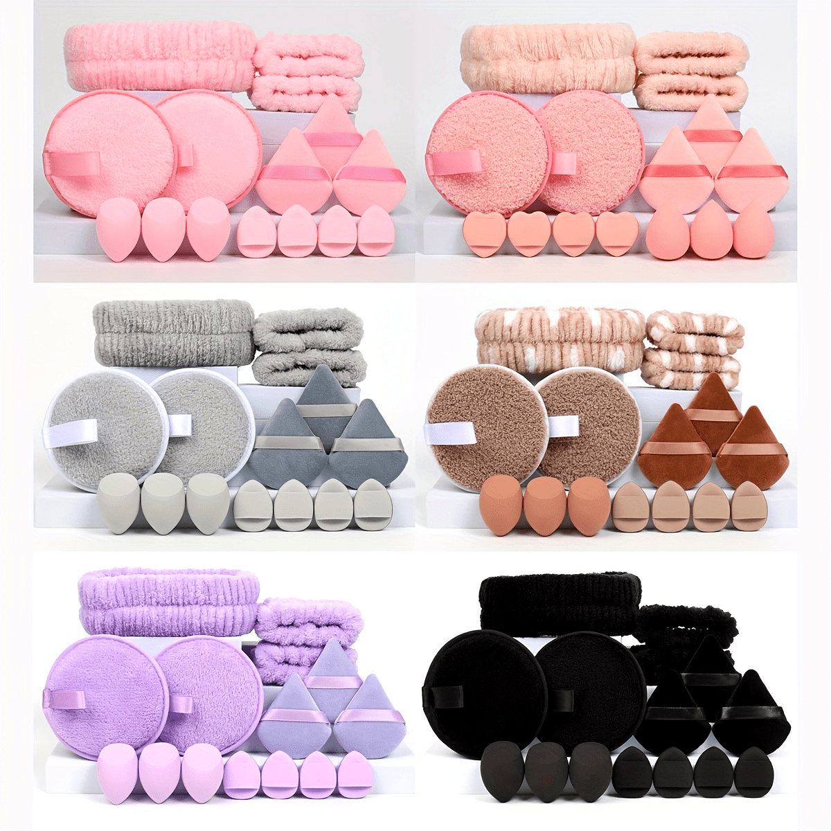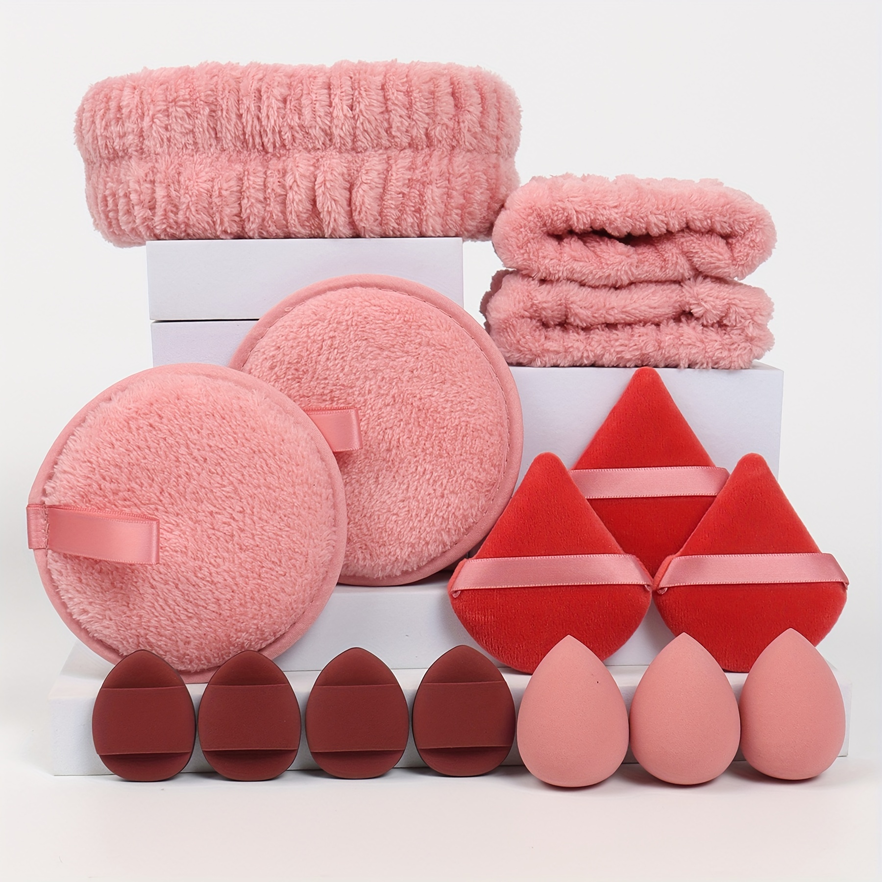 15pcs set of hair tie lazy puff. 2 face wash puffs & 3 makeup sponges & 3 triangular loose powder puffs & 4 mini air cushions & 1 headband & 2 wristbands. Facial sponge, used for daily exfoliation and cleansing, foam removal and facial scrubbing