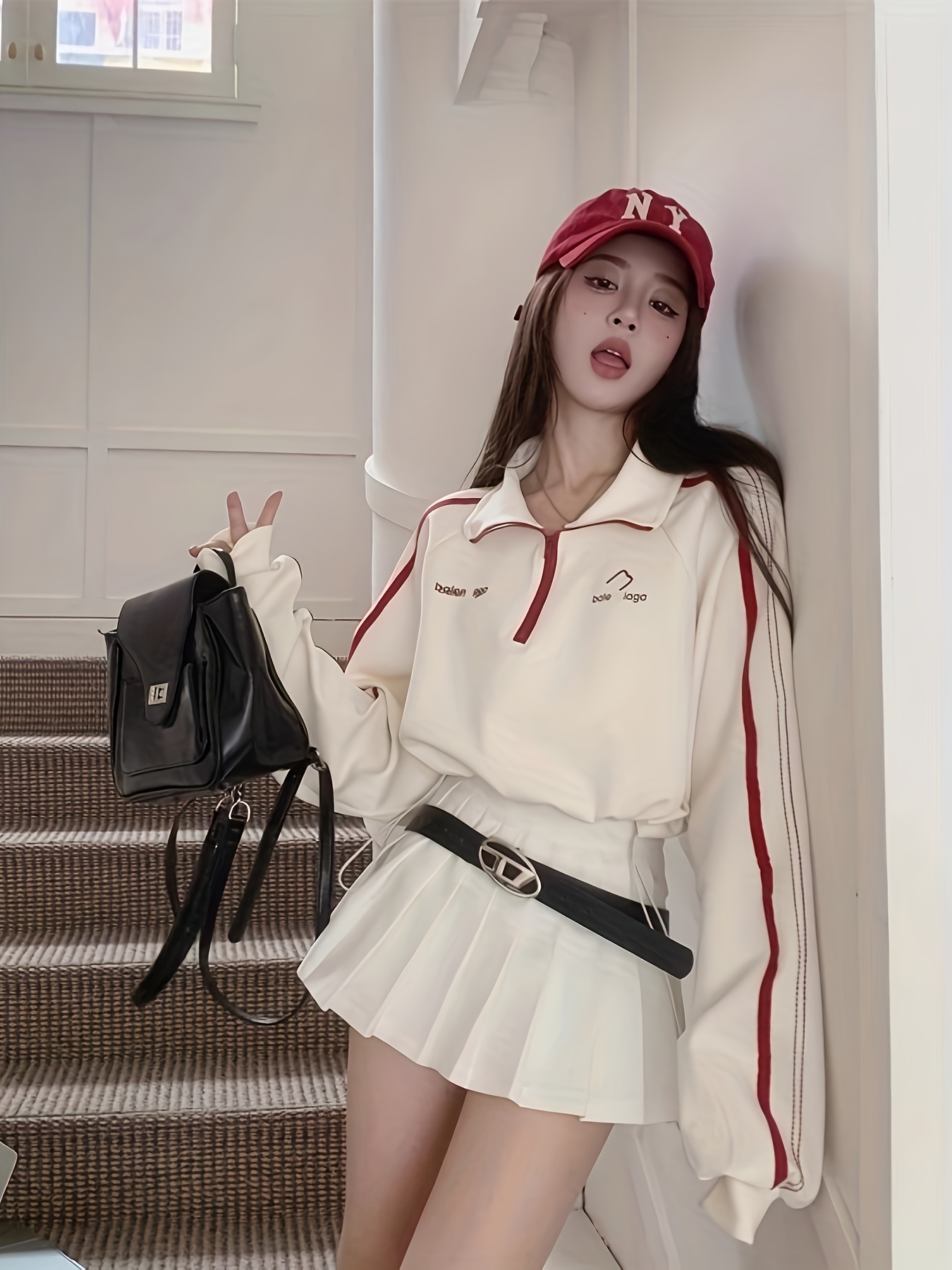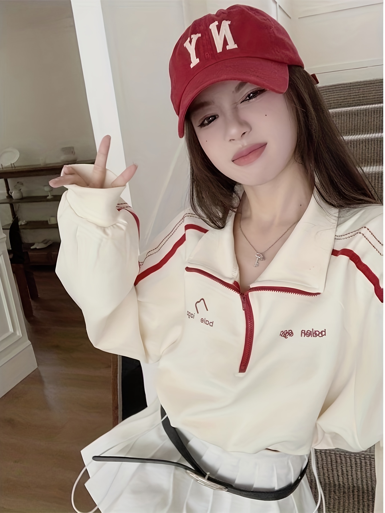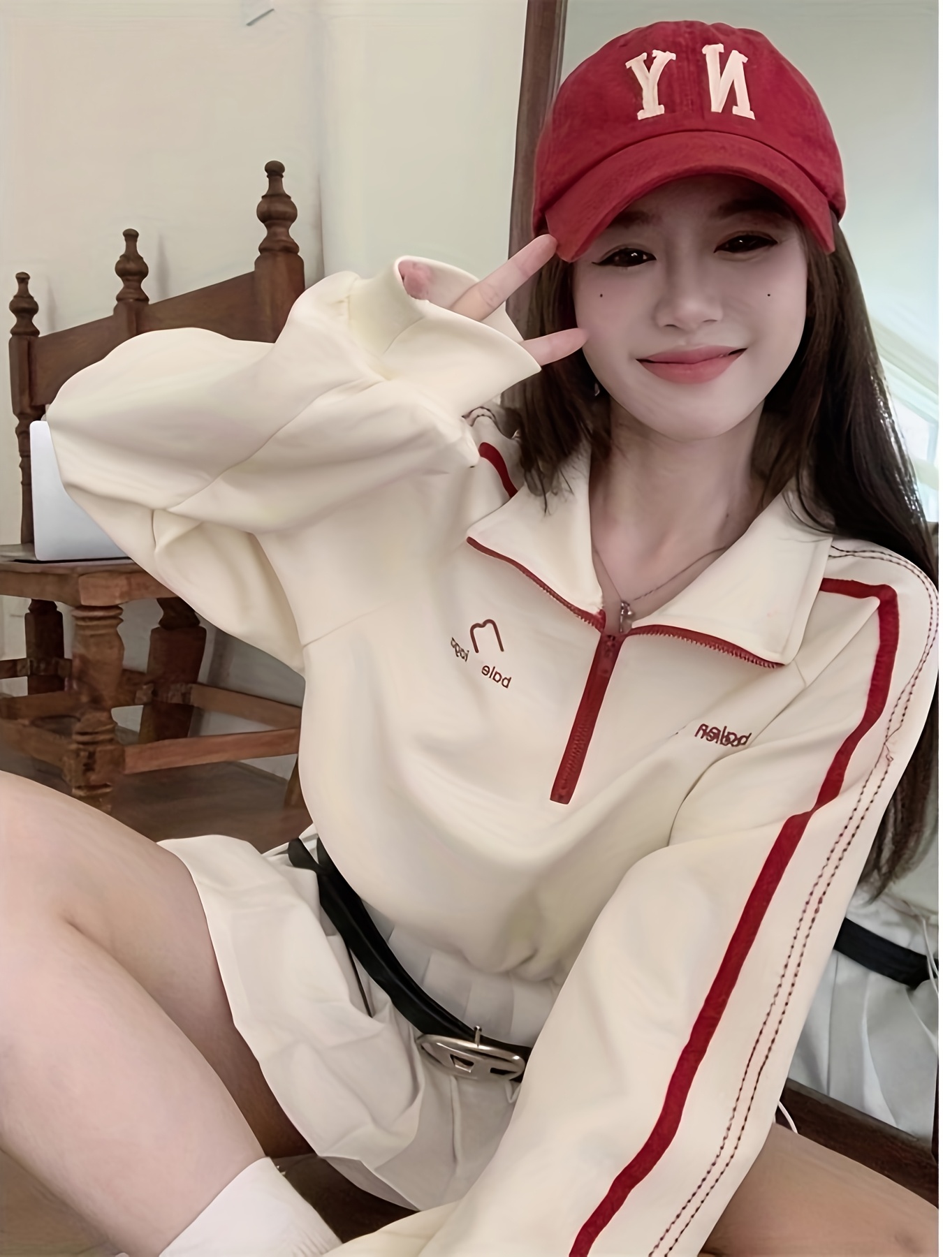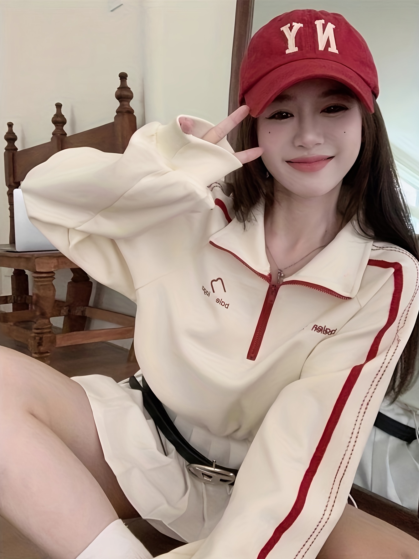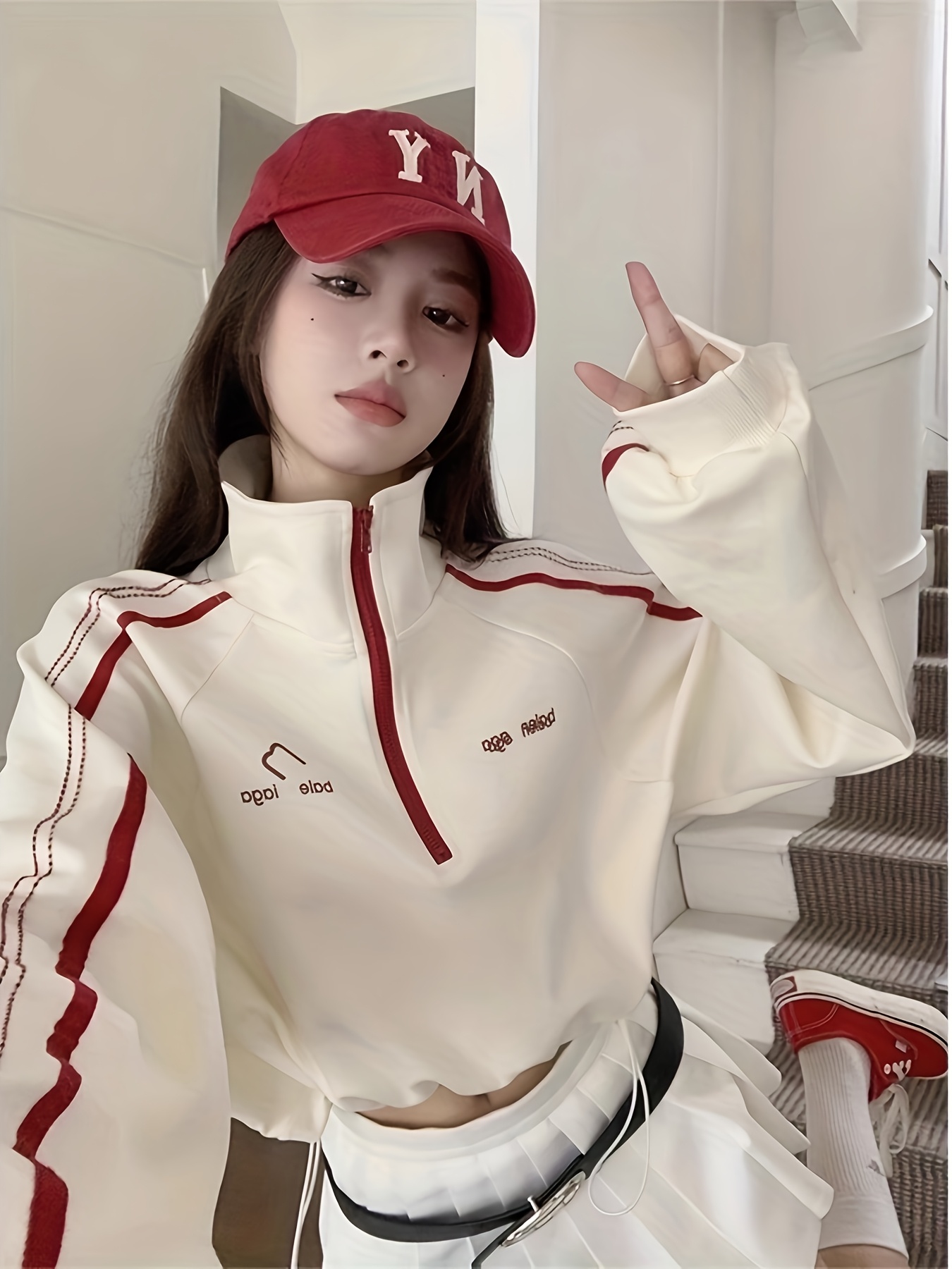 Early Spring New Style Stand Collar Long Sleeve Color Block Hoodie Women’s Design Half-Zip Short Casual Top
