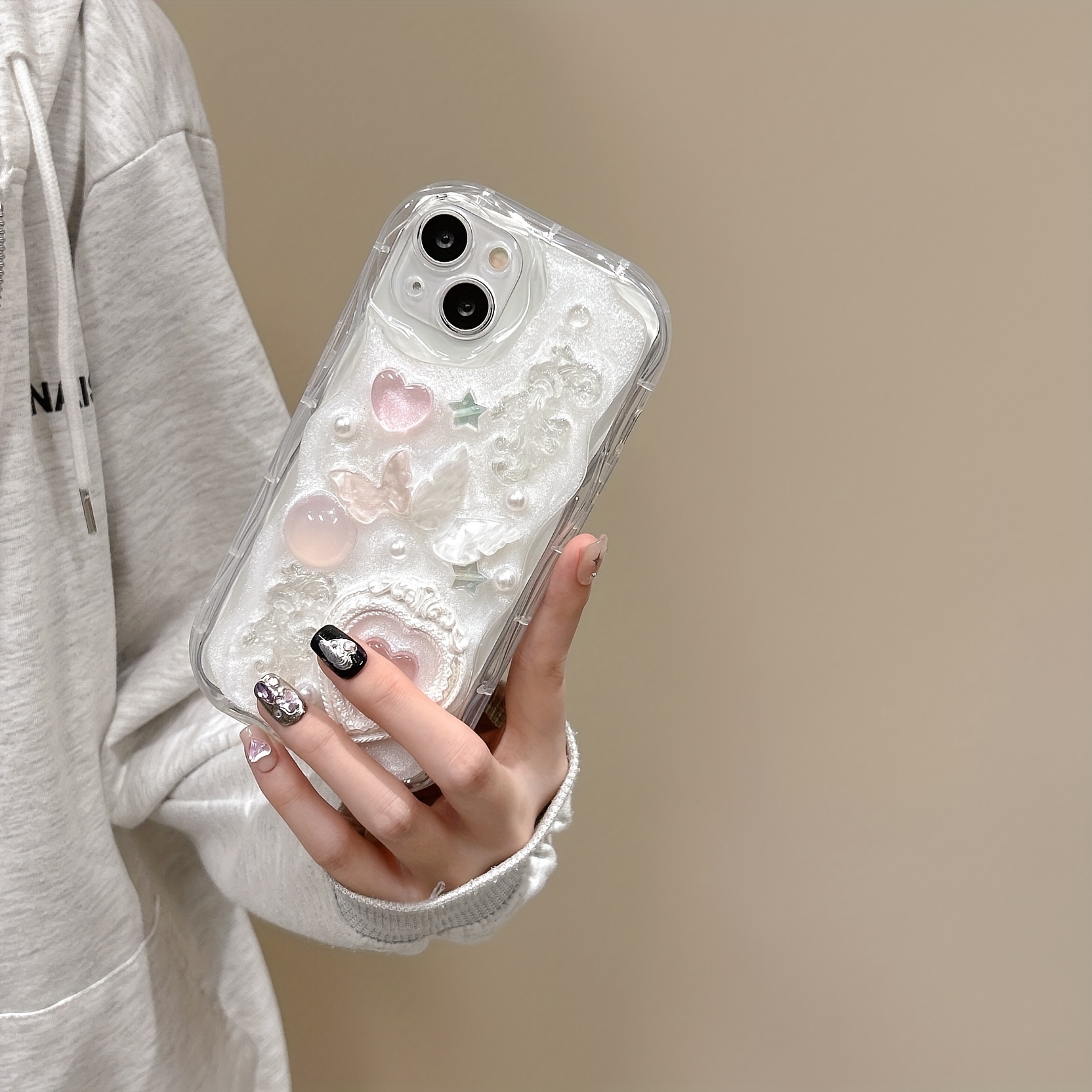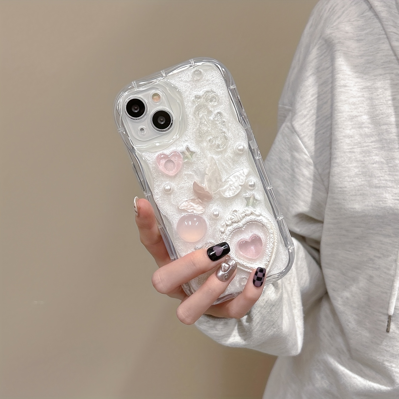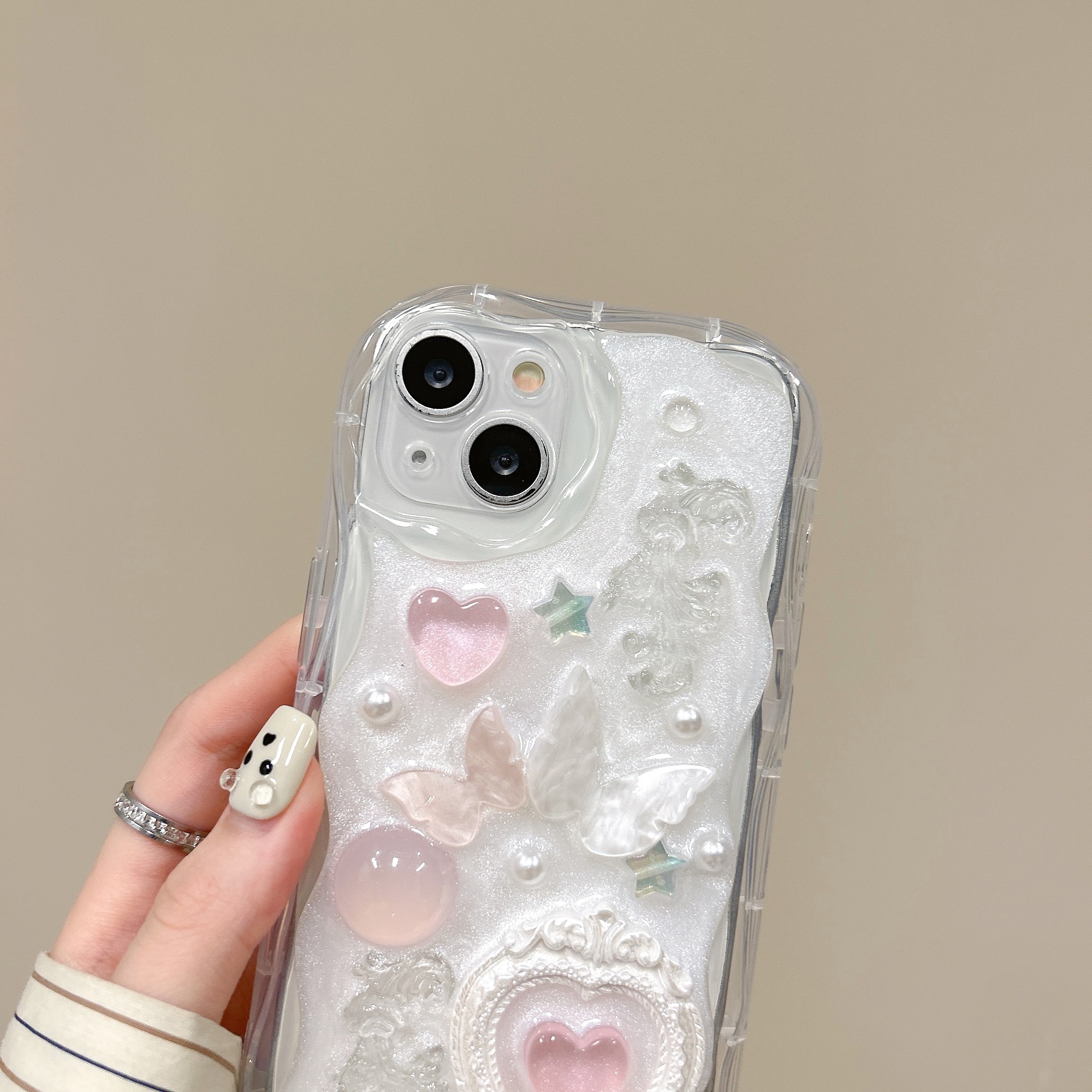 For Iphone Curved Edge Drop Glue Cream Paint Pink Heart-Shaped Butterfly Anti Drop Phone Protective Case