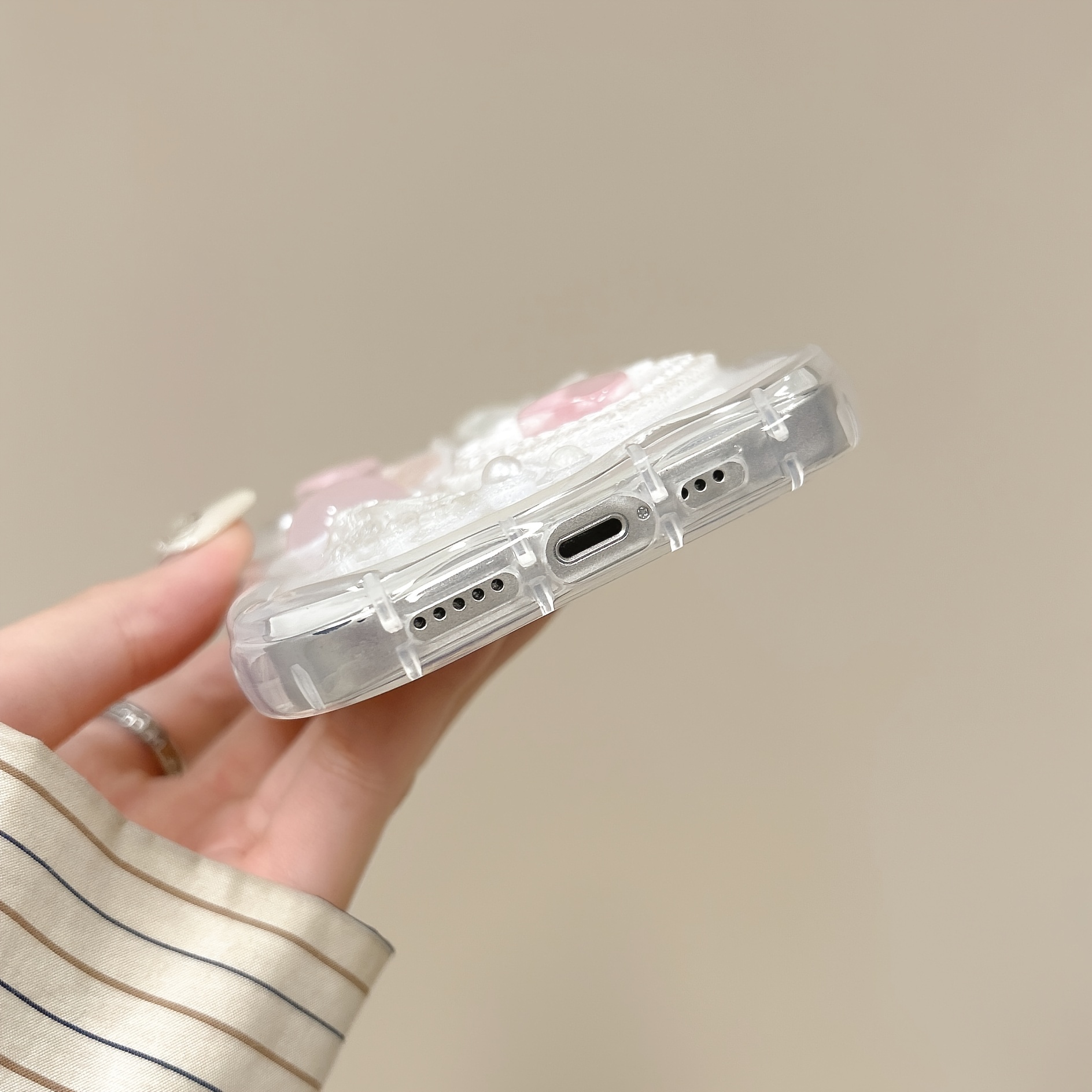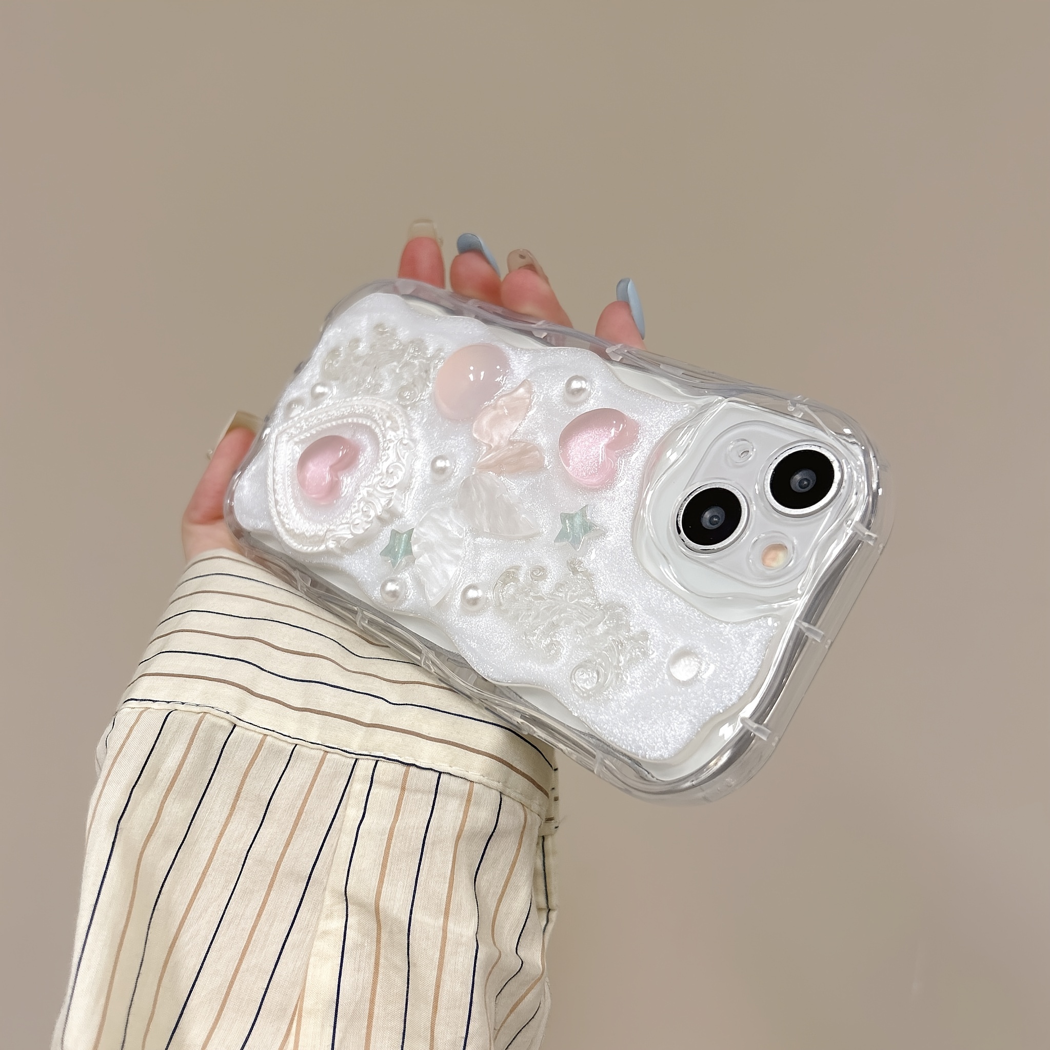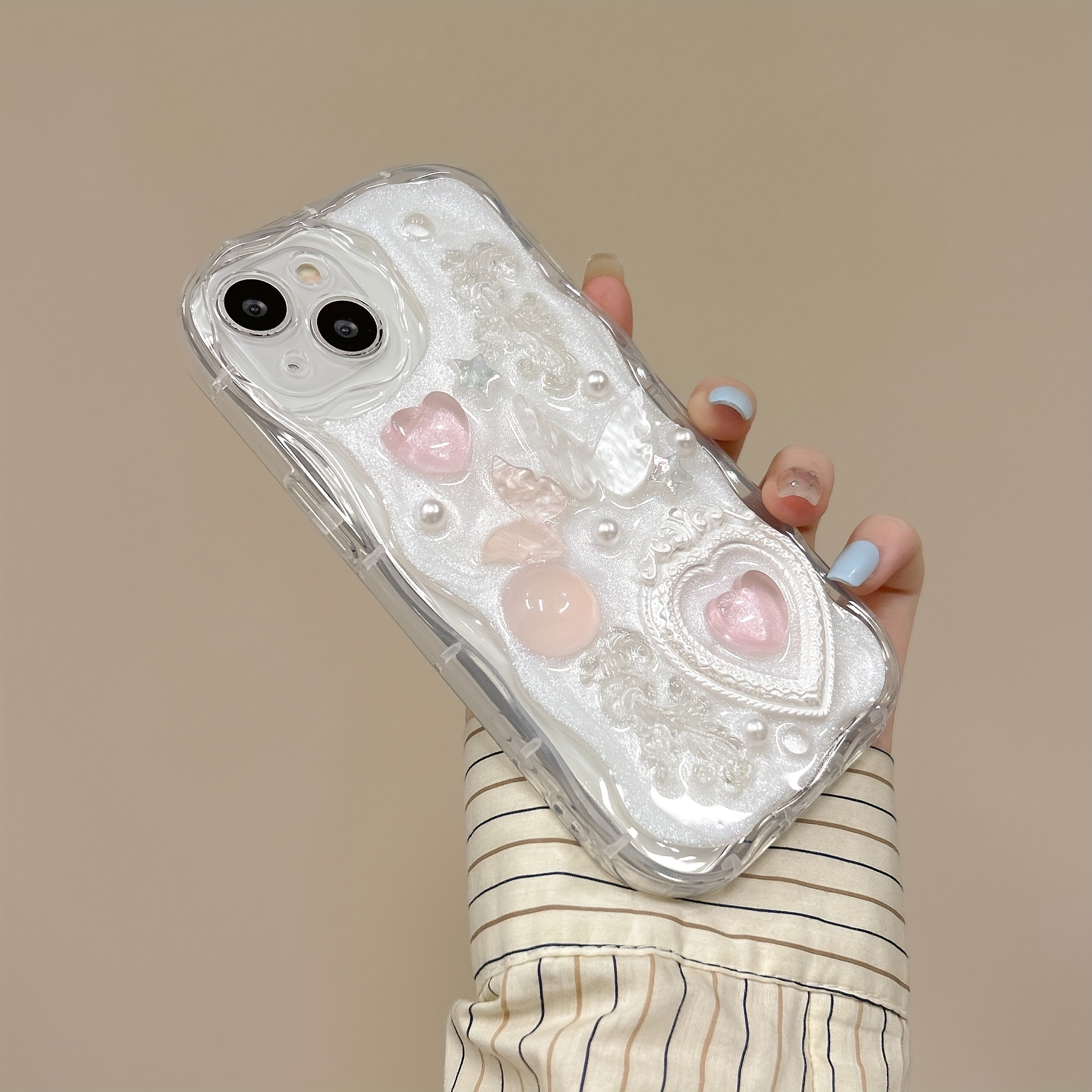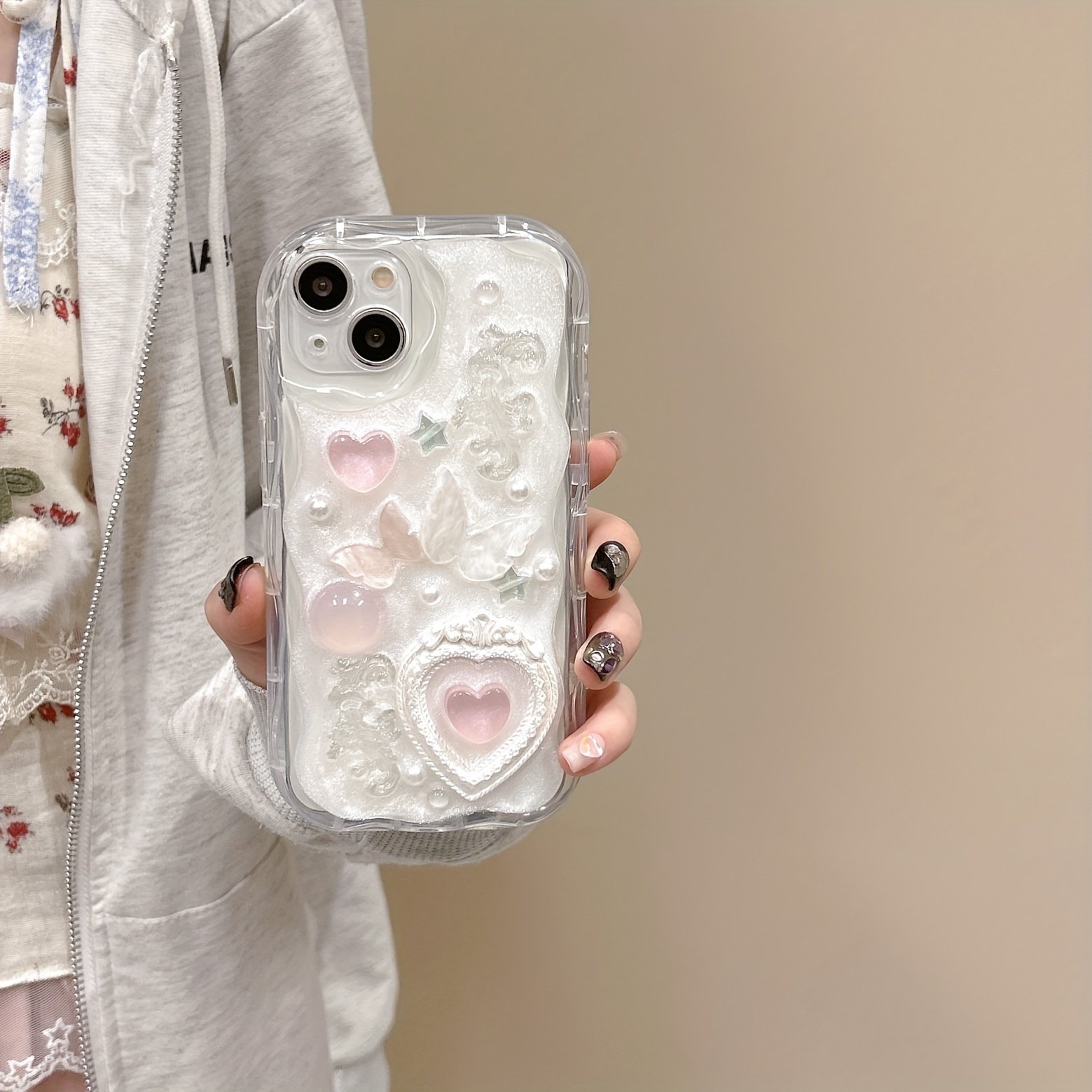 For Iphone Curved Edge Drop Glue Cream Paint Pink Heart-Shaped Butterfly Anti Drop Phone Protective Case
