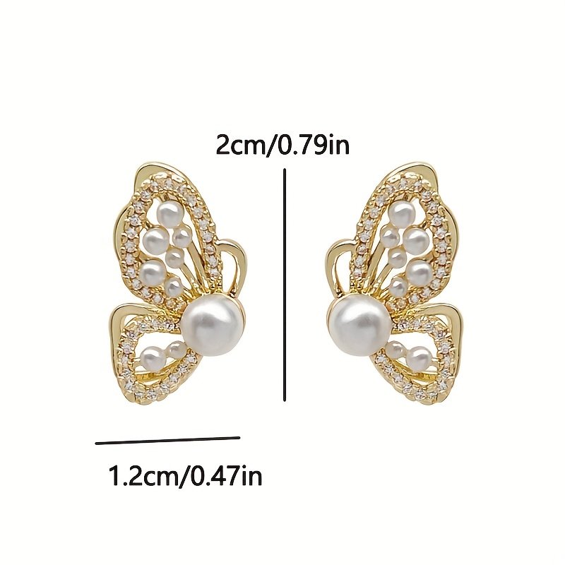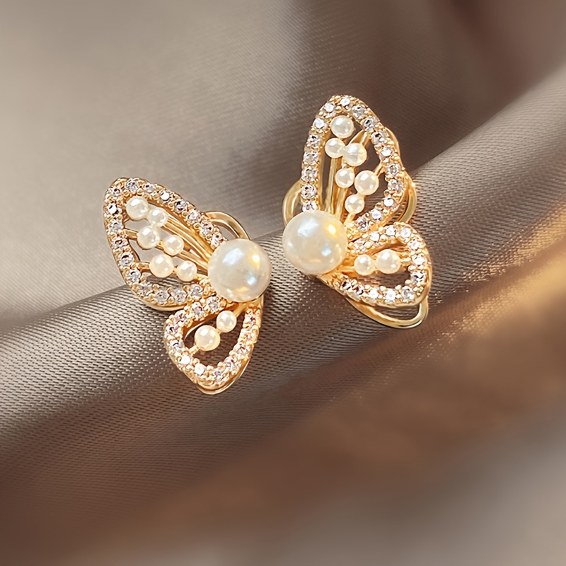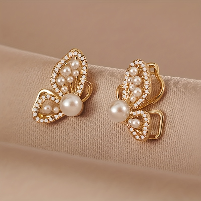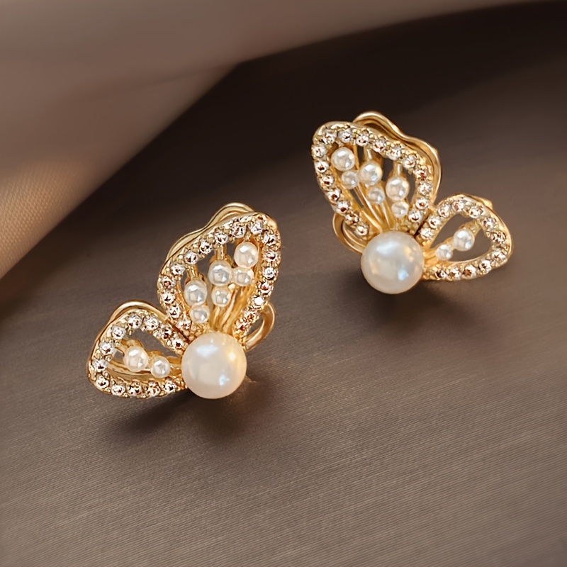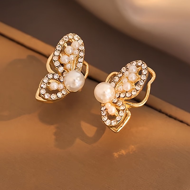 Pair of Elegant Golden-Tone Butterfly Stud Earrings with Sparkling Rhinestones & Pearl Centers – Luxurious Alloy Jewelry, Ideal Valentine’s Day Gift for Her, Elegant Accessories|Butterfly Motif|Rhinestone Embellishments, Butterfly Earrings
